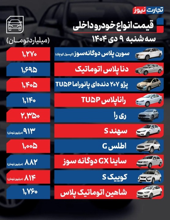 قیمت آنلاین خودرو امروز سه‌شنبه 9 دی 1404 + جزئیات